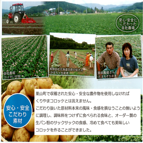 かぼちゃコロッケ:甘みが強く、カロチンも豊富な北海道栗山産のかぼちゃを皮まで一緒に蒸かしているので、かぼちゃ本来のうまみがつまっています。調味料をつけず、おやつやつまみとしてもお召し上がり出来ます。